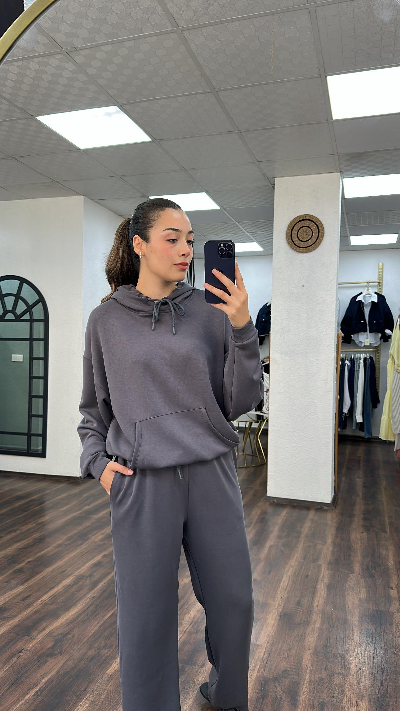 Sweat kapişonludur, ön ceplidir. Eşofman bol paçadır, kumaş modaldır.eşofman bel lastikli ve iplidir.