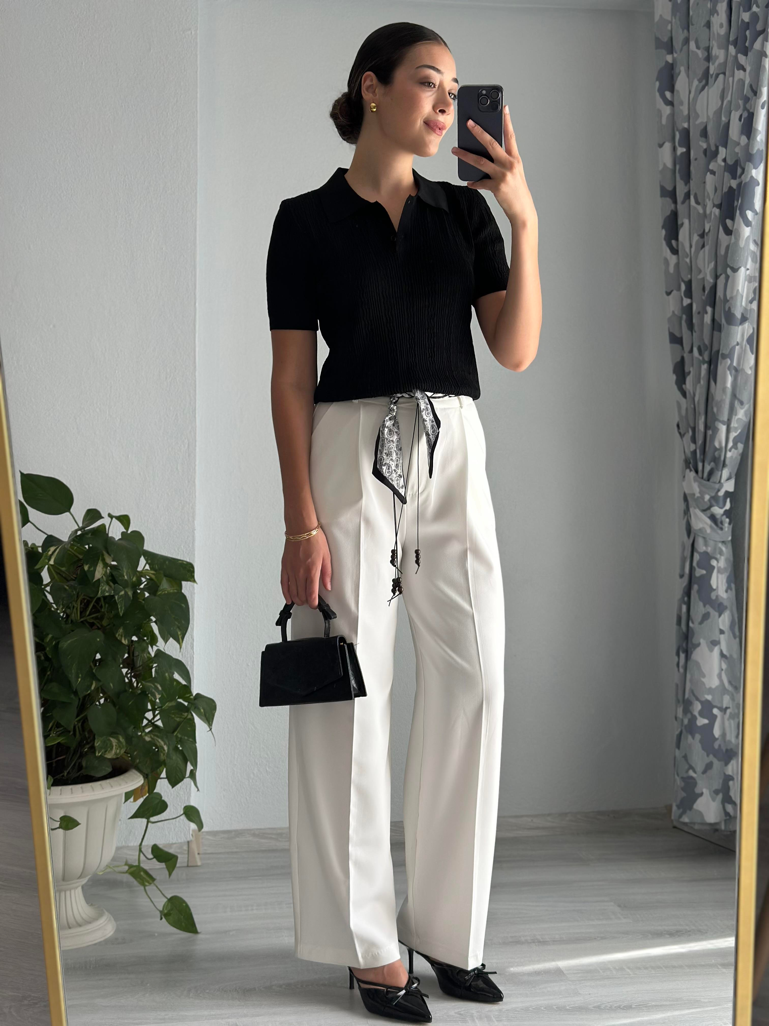 Yüksel bel, tek pileli, iki cepli, kemerli, palazzo pantolon