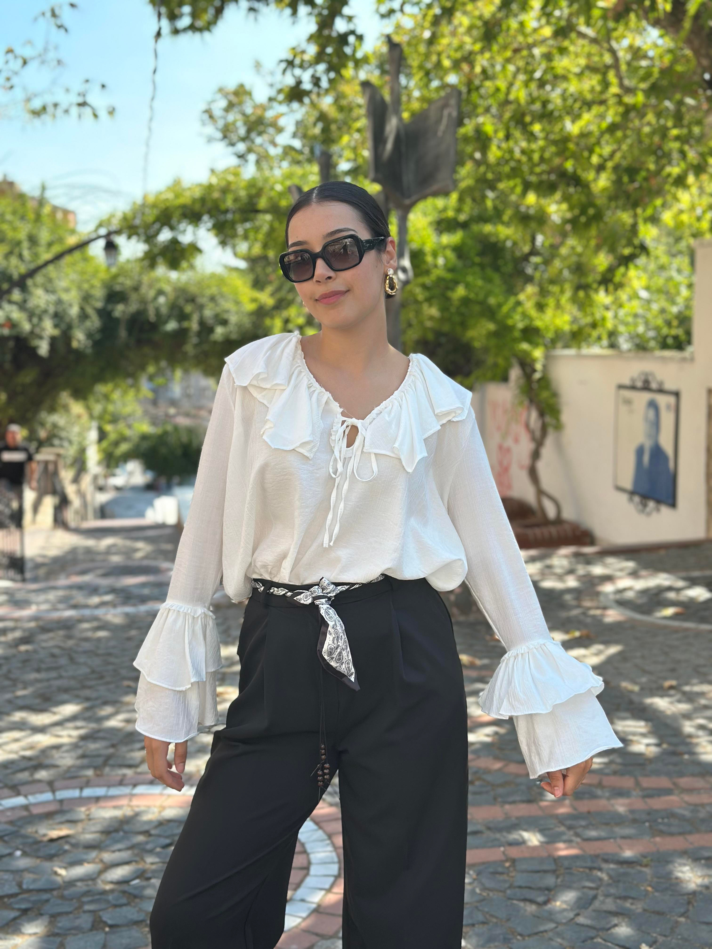 Uzun kollu, kolları fırfırlı ve ip detaylı, V yaka, yakası ip bağlamalı