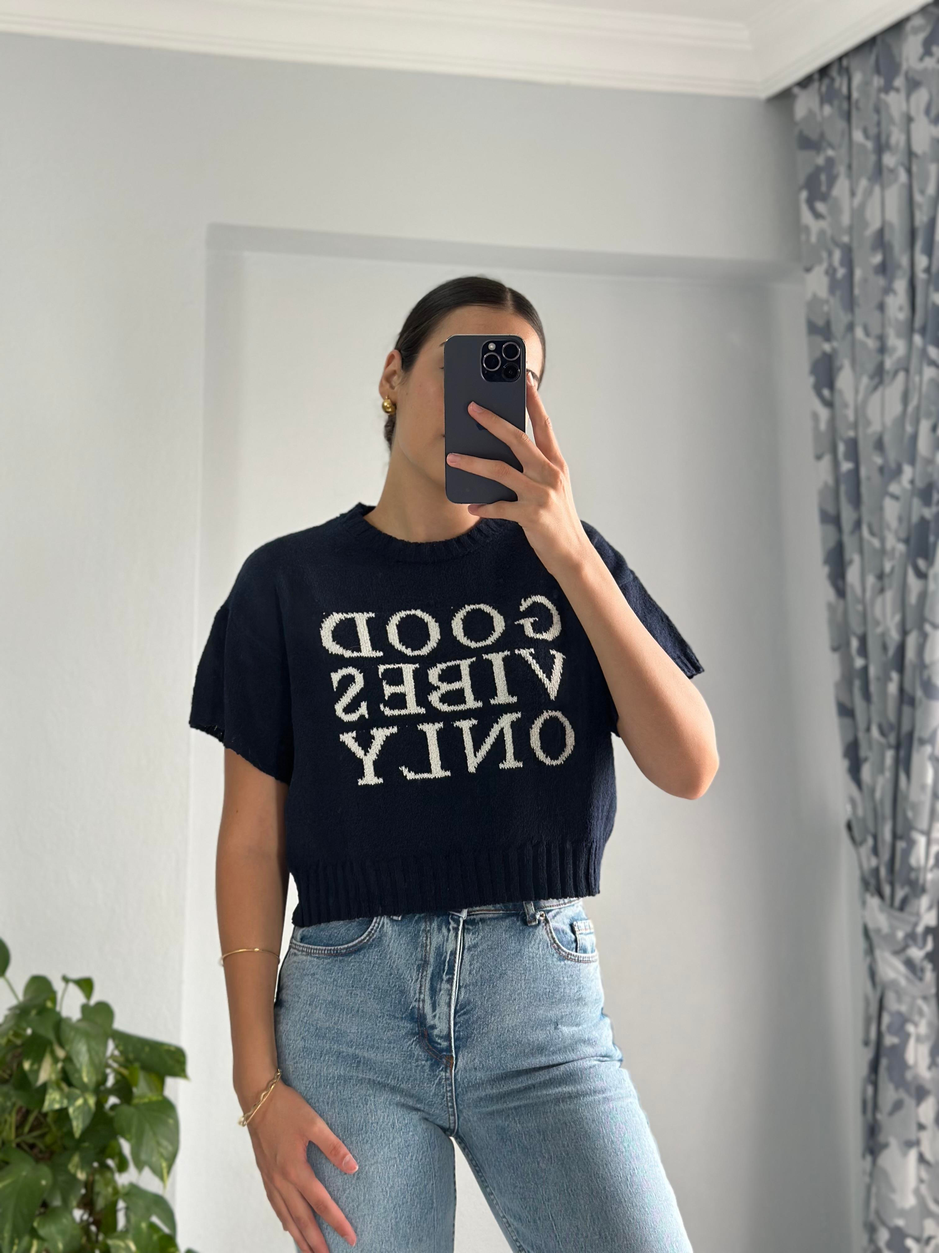 Lacivert Yarım Kol Önü Bej Yazılı Kazak